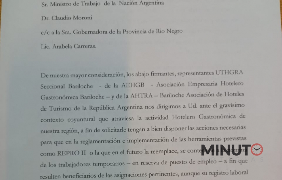 “De nuestra mayor consideración, los abajo firmantes, representantes UTGHRA Seccional Bariloche - de la AEHGB – Asociación Empresaria Hotelero Gastronómica Bariloche – y de la AHTRA – Bariloche Asociación de Hoteles de Turismo de la República Argentina nos dirigimos a Ud. Ante el gravÃsimo contexto coyuntural que atraviesa la actividad Hotelero Gastronómica de nuestra región, a fin de solicitarle tengan a bien disponer las acciones necesarias para que en la reglamentación e implementación de las herramientas previstas como REPRO II o la que en el futuro la reemplace, se contemple a la nómina de los trabajadores temporarios – en reserva de puesto de empleo – a fin que resulten beneficiarios de las asignaciones pertinentes, aunque su registro laboral no cuente con remuneración y/o asignación positiva precisamente por encontrarse paralizado el ciclo temporario.