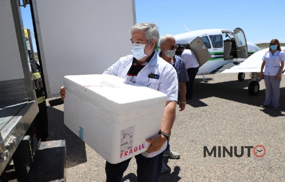Con una importante logÃstica preparada para la ocasión, las cajas refrigerantes fueron traspasadas desde la bodega del avión provincial a un camión térmico de una empresa alimenticia de la zona.