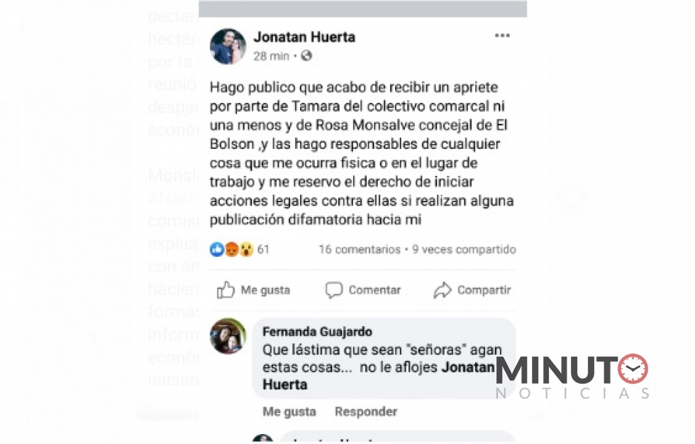 "Desde la Sociedad Argentina de Locutores y Comunicadores Delegación Andina repudiamos los agravios contra el compañero Jonatán Huerta. No hay que escudarse en el género para defender y agredir a alguien. Si la crÃtica es por el mal desempeño de funcionaria pública no es una agresión de género es por el cargo que se ocupa. Por ello repudiamos a la Edil de El Bolsón, Rosa Monsalve del Frente de Todos y le exigimos las disculpas correspondientes. "