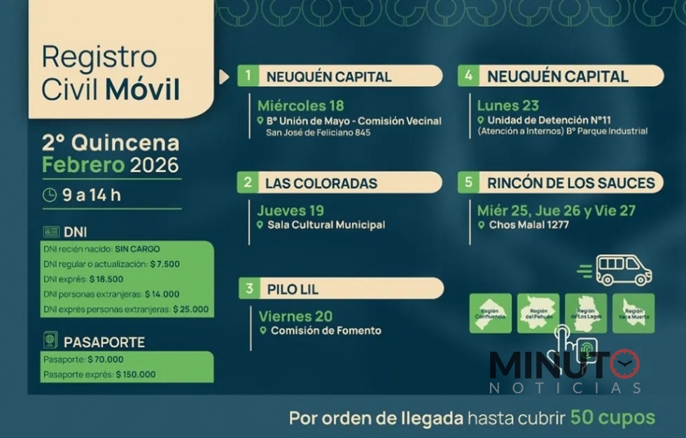 La dirección provincial del Registro Civil y Capacidad de los Personas -dependiente del ministerio de Gobierno, Mujeres y Derechos Humanos- informó que el segundo cronograma de febrero, correspondiente a la segunda quincena del mes que comenzará el miércoles 18 con la presencia del dispositivo móvil en la Comisión Vecinal del barrio Unión de Mayo, ubicada en San José de Feliciano 845, en la ciudad de Neuquén.