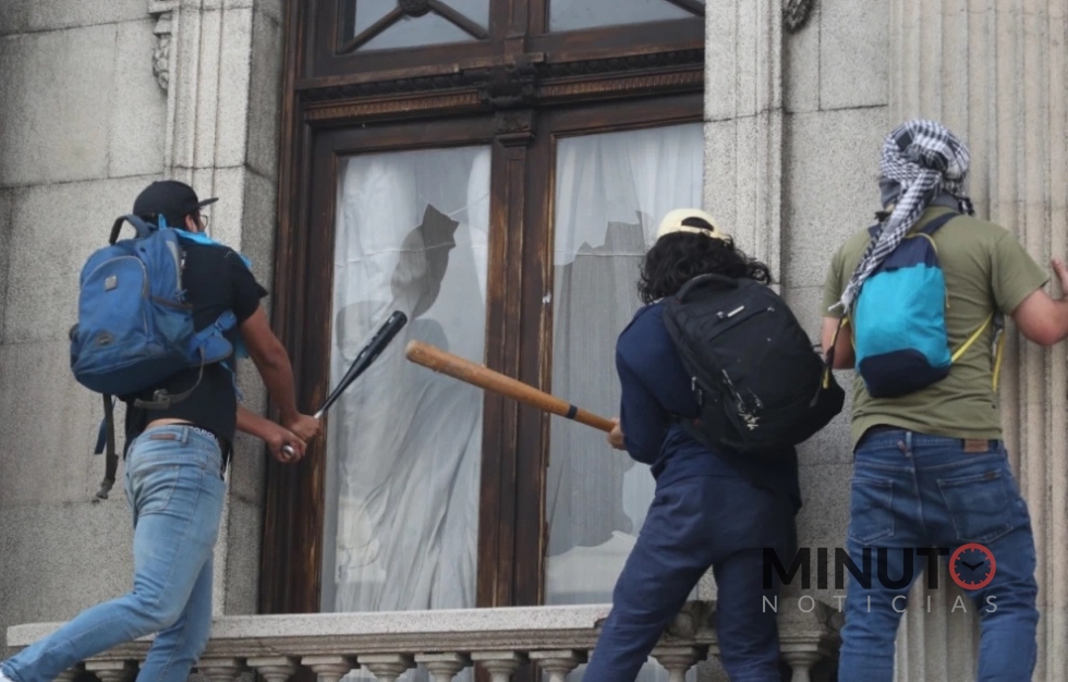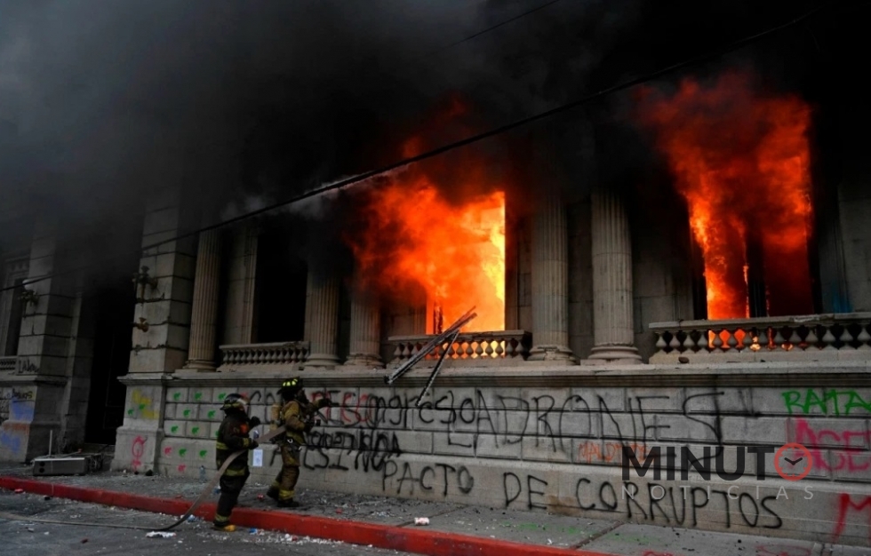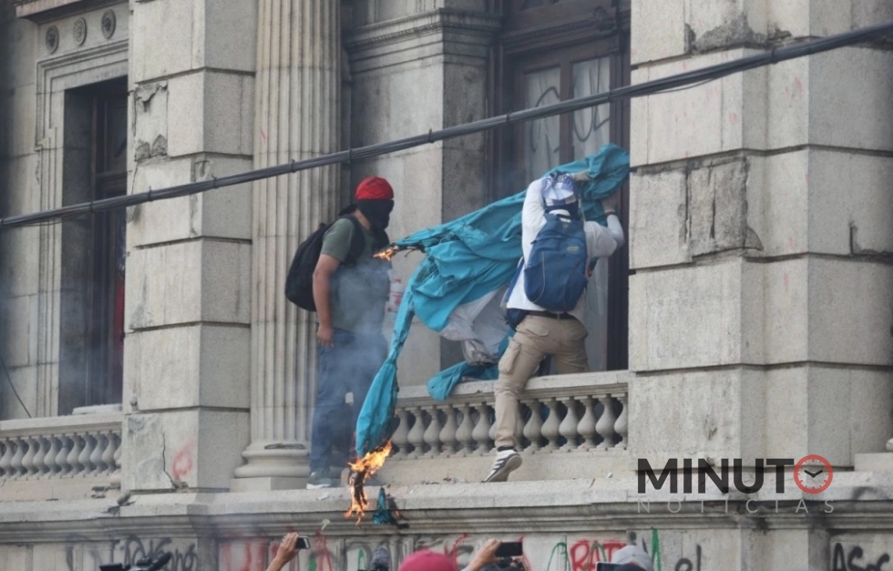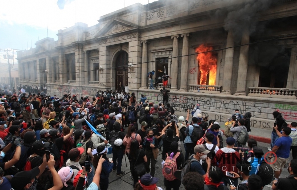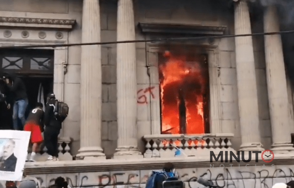 Centenares de manifestantes, muchos de ellos encapuchados, tomaron brevemente y prendieron fuego a oficinas del Congreso de Guatemala este sábado.