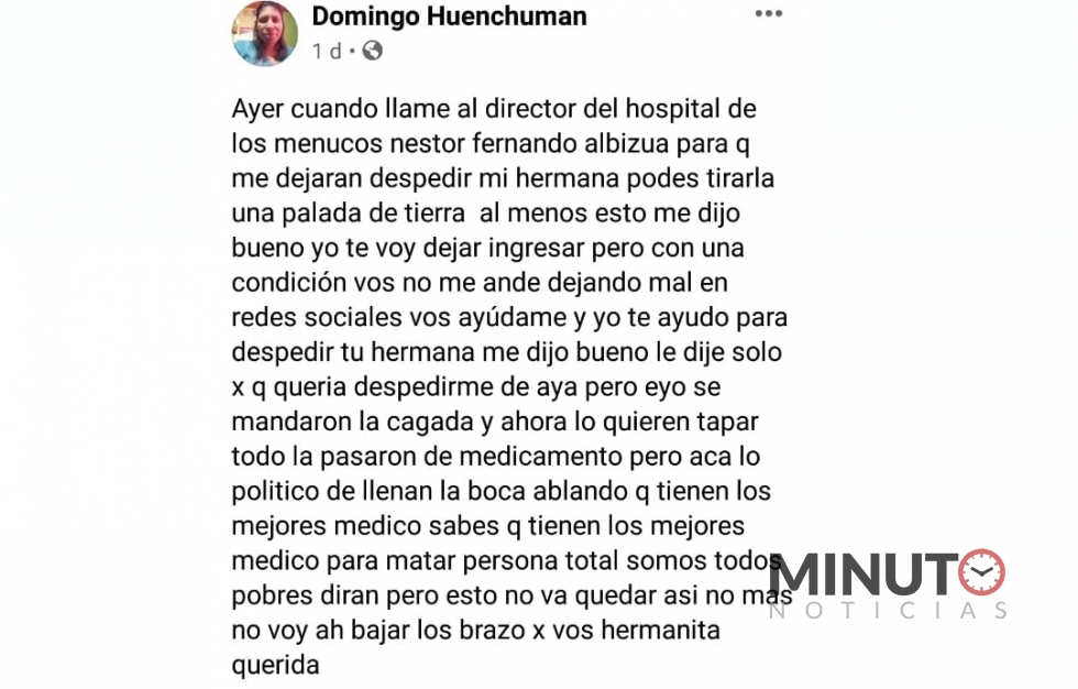 En la noche de ayer, Domingo habÃa publicado en su cuenta de Facebook una denuncia pública en contra del Director del Hospital de Los Menucos, Fernándo Albizua.