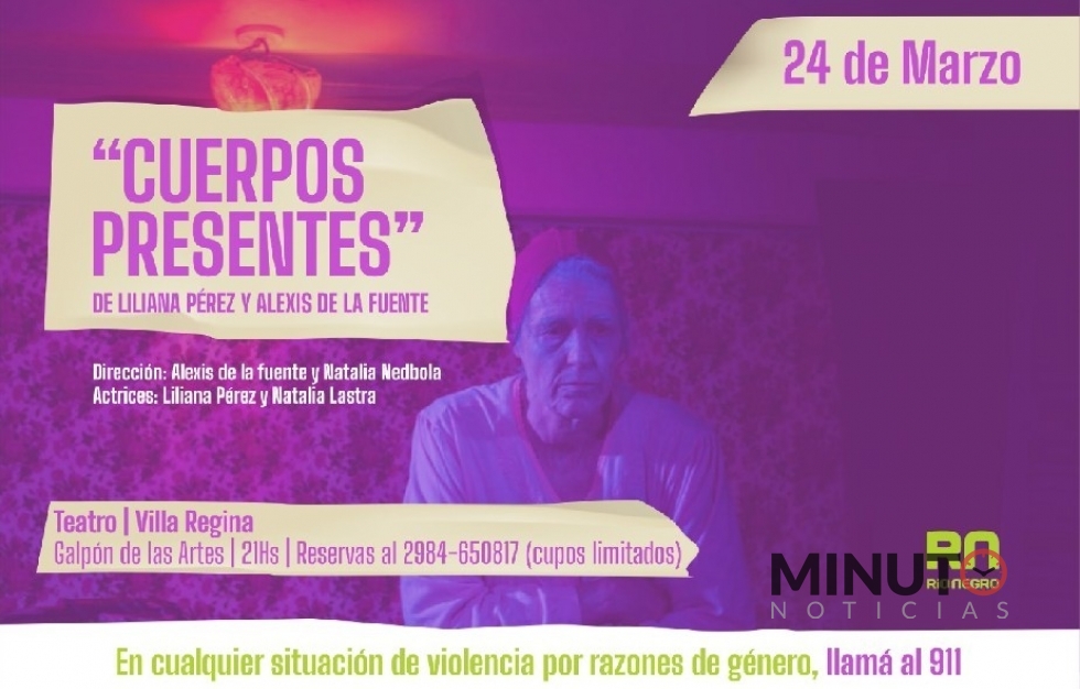 "Cuerpos Presentes" es una obra que retrata los años de dictadura en Argentina y se presentará en coincidencia con la semana de la Memoria. El evento iniciará a las 21 en el teatro Galpón de las Artes de la localidad de Villa Regina con cupos limitados en cumplimiento de los protocolos sanitarios vigentes.