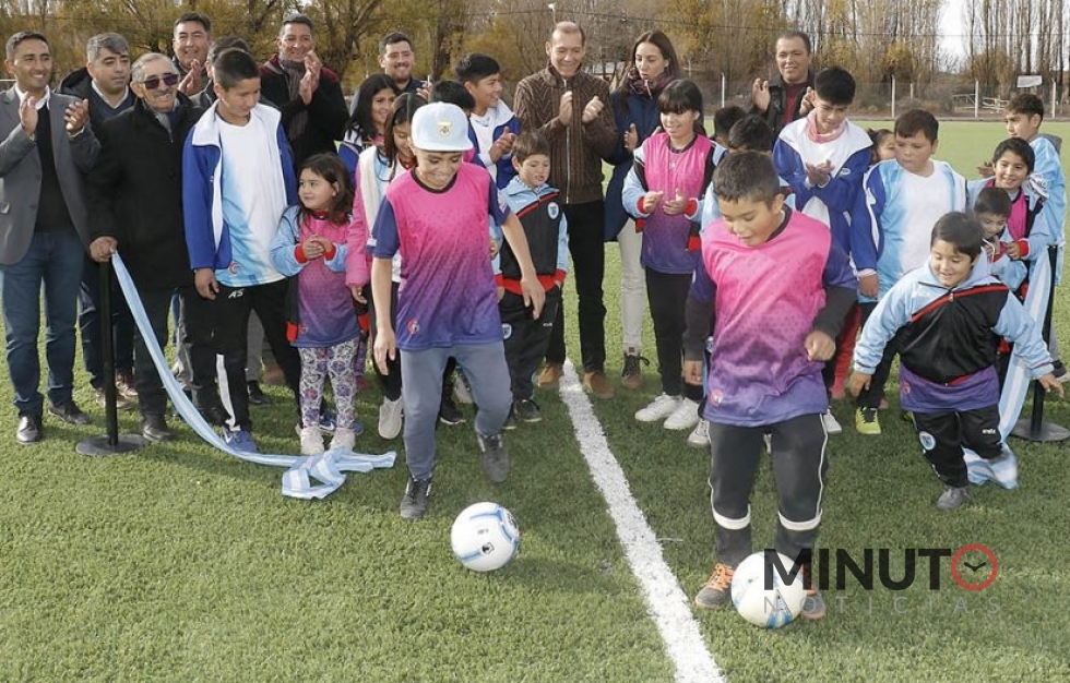 El gobernador Omar Gutiérrez y el presidente de la comisión de fomento de El Sauce, Edgardo Torres, inauguraron este jueves una cancha de césped sintético, como parte de los festejos por el 35º aniversario de la localidad.
