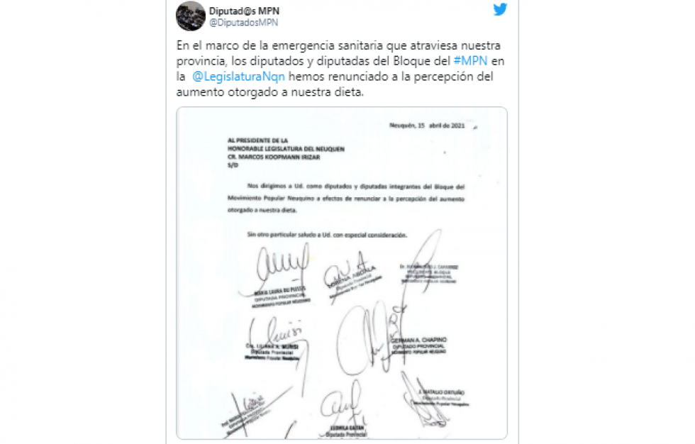 Los diputados y diputadas del bloque del Movimiento Popular Neuquino (MPN) renunciaron a cobrar el aumento de 70 mil pesos que se habÃan asignado semanas atrás. El primer paso lo dio la legisladora Carina Riccomini, de la colectora Juntos, quien este domingo por la noche resignó su incremento y pidió que se destine al hospital Castro Rendón. Horas después, todo el bloque del MPN desistió también de la suba como un gesto de austeridad, en consonancia con el anuncio del gobernador Omar Gutierrez del congelamiento de sueldos de la planta polÃtica.
