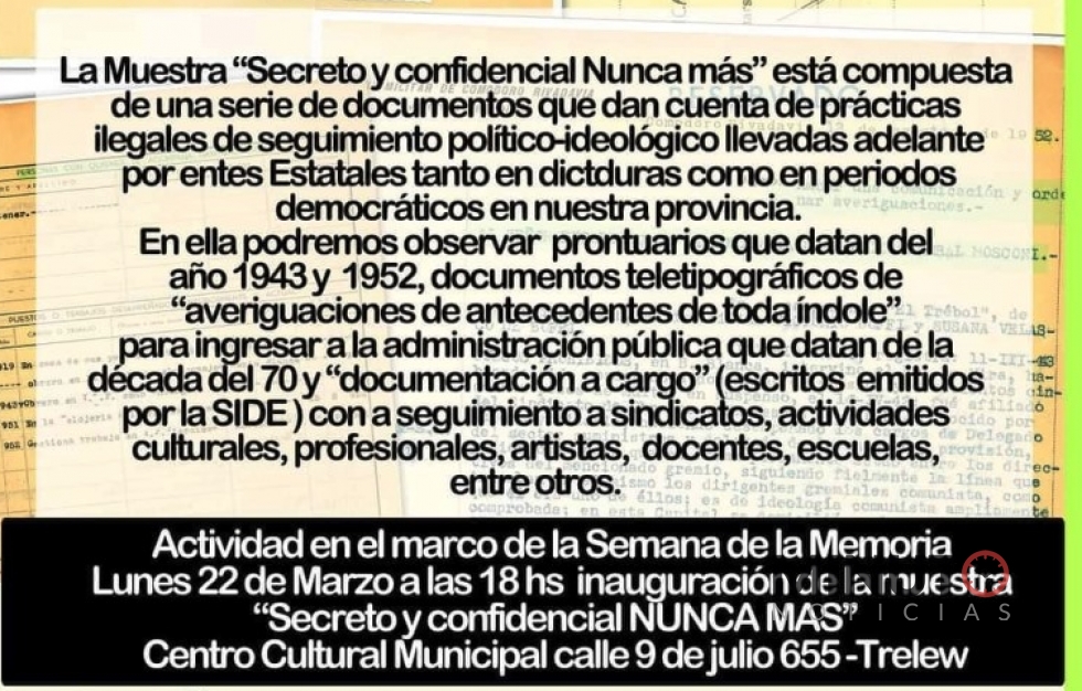 En el marco de las actividades programadas por la Semana de la Memoria, la Subsecretaría de Derechos Humanos, dependiente del Ministerio de Gobierno y Justicia de la Provincia, junto a la Dirección de Cultura de Trelew, invita la inauguración de la muestra «Secreto y confidencial NUNCA MAS». La misma tendrá lugar este lunes 22 a las 18 horas, en el Centro Cultural Municipal, ubicado en calle 9 de Julio Nº 655 de dicha ciudad.