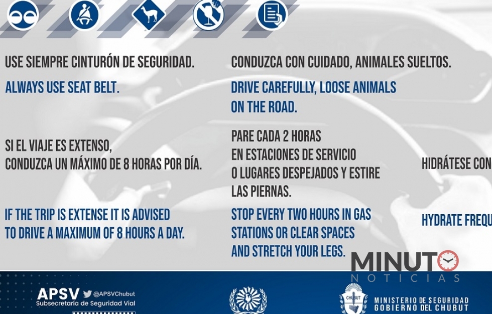 El Ministerio de Seguridad del Chubut, a través de la SubsecretarÃa de Seguridad Vial, instrumentará un plan especÃfico de prevención ante la gran afluencia vehicular que se espera en las principales rutas y destinos turÃsticos de la provincia por el fin de semana largo.