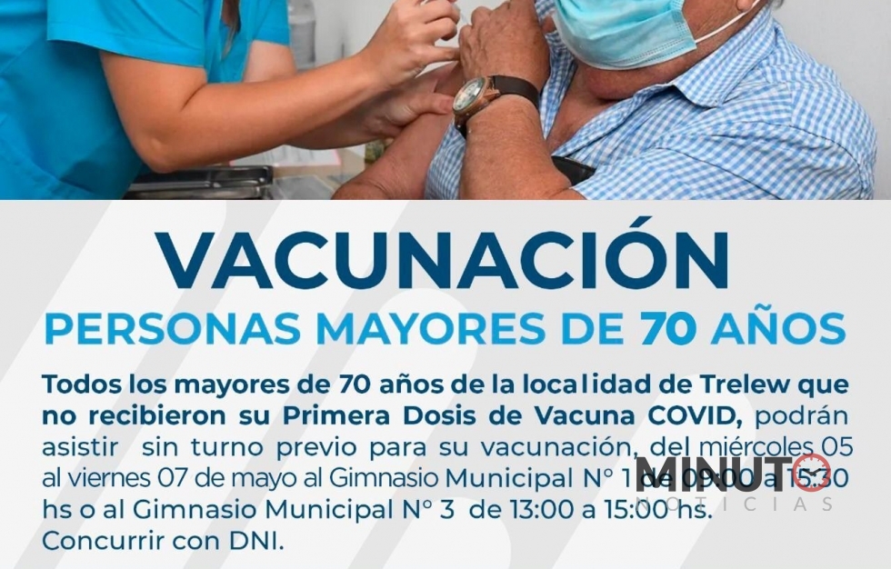 El Gobierno del Chubut, a través del Ãrea Programática de Salud Trelew y el Hospital Zonal “Dr. Adolfo Margara†de Trelew dependientes del Ministerio de Salud, informó que todas las personas mayores de 70 años de dicha localidad, que aún no recibieron la primera dosis de la vacuna contra el Covid-19, podrán asistir a los vacunatorios sin turno previo para aplicársela entre el miércoles 5 y el viernes 7 de mayo.