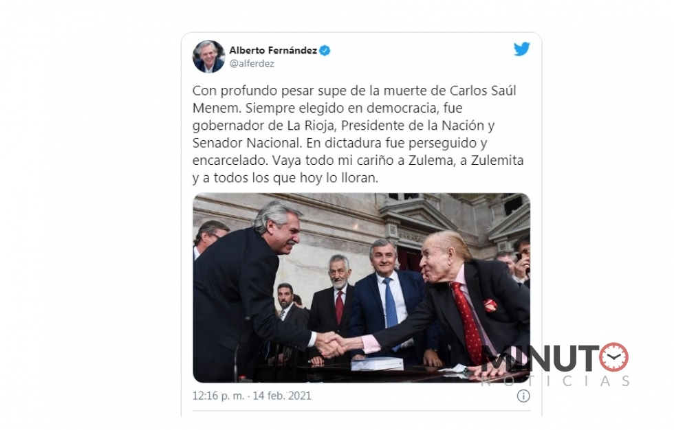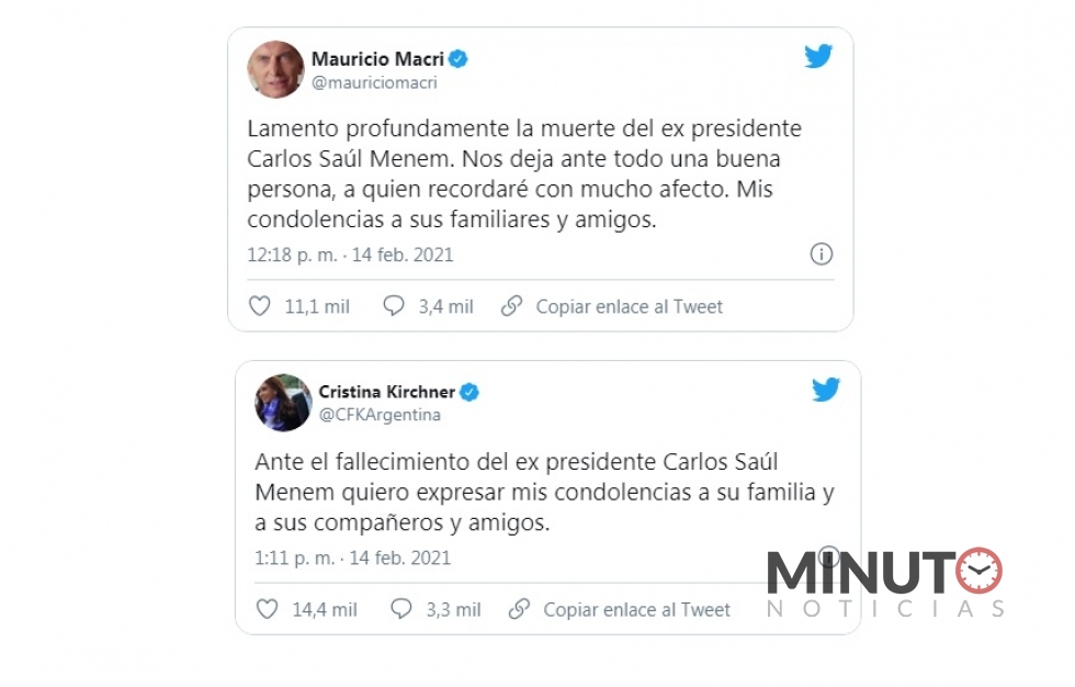 Por su parte, la expresidenta y actual vicepresidenta Cristina Kirchner expresó sus condolencias a la familia y compañeros de Menem.