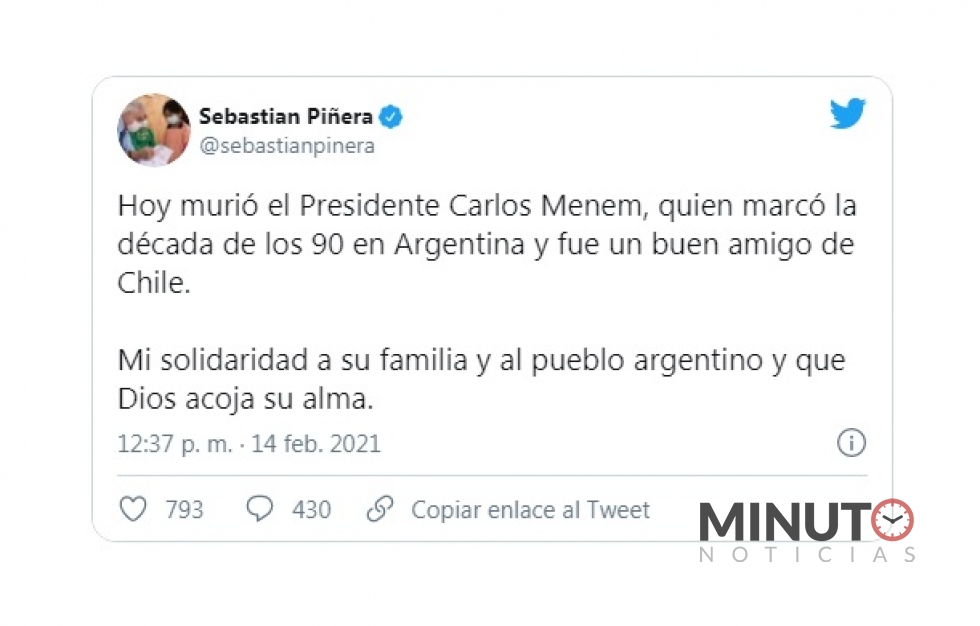 El expresidente de Argentina Mauricio Macri también se pronunció tras la muerte de Menem. “Nos deja ante todo una buena persona, a quien recordaré con mucho afectoâ€, dijo.