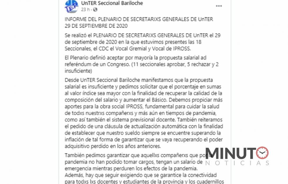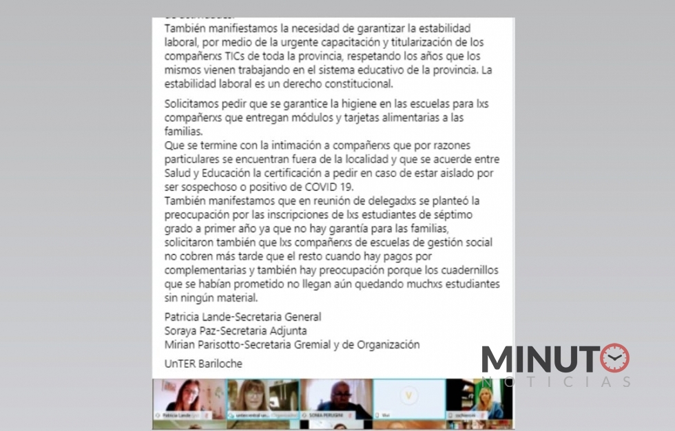El comunicado fue publicado en las redes sociales de UnTER seccional Bariloche y firmado por la Secretaria General, Patricia Lande, la Secretaria Adjunta, Soraya Paz y la Secretaria Gremial y de Organización, Mirian Parisotto.